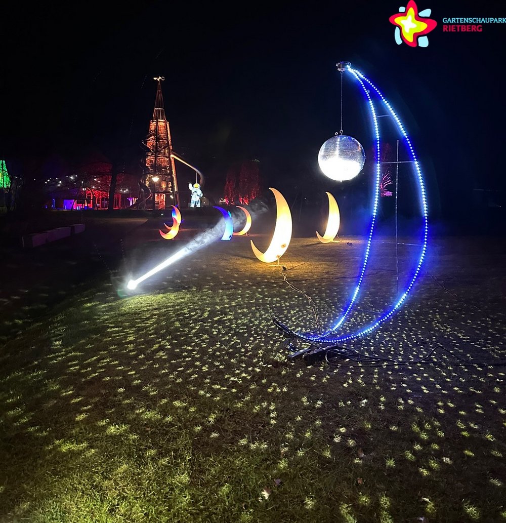 Zu viel soll nicht verraten werden, aber die mit viel Liebe zum Detail von Flash-Art- Tüftler Urs Lange und seinem Team installierten Illuminationen bieten an vielen Stellen echte Überraschungsmomente. Wichtig ist, tatsächlich auch dem Rundweg zu folgen, denn nur so entfalten die 21 Stationen ihre volle Wirkung. Damit alles richtig zur Geltung kommt, wurden etwa 20 Kilometer Kabel verlegt und zehntausende Lichter verbaut. Nun bewacht der gar nicht so zwergenhafte Zwerg Carl die Outdoor-Foto-Galerie, und ein Astronaut scheint in den raketenhaften Rutschenturm einsteigen und abheben zu wollen. Auf der großen Wiese ist eine eindrucksvolle Lasershow zu sehen, die sich bis in die Baumkronen erstreckt. Kurz: Es gibt jede Menge Magisches und Mystisches zu entdecken, und die passend dazu hinterlegten Klänge sorgen dafür, dass die im Untertitel angekündigte „Poesie aus Licht und Klang“ Wirklichkeit wird. Hier dürfte die ganze Familie ins Träumen und Staunen geraten. Und, ganz wichtig: Alle Spielplätze sind in die Traumpfade integriert, illuminiert und bespielbar.